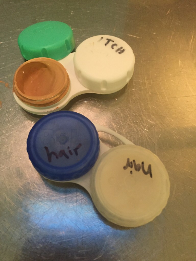 - Toothbrush, toothpaste, floss, contacts, solution, Deodorant, Q-tips, Nail clippers, Bobby pin, Makeup (foundation, eyeliner), Baby wipes, Hair gel, Shampoo, Bar Soap, Lotion, Tweezers, Hand sanitizer, Razor (which I forgot, but he should have made the cut)