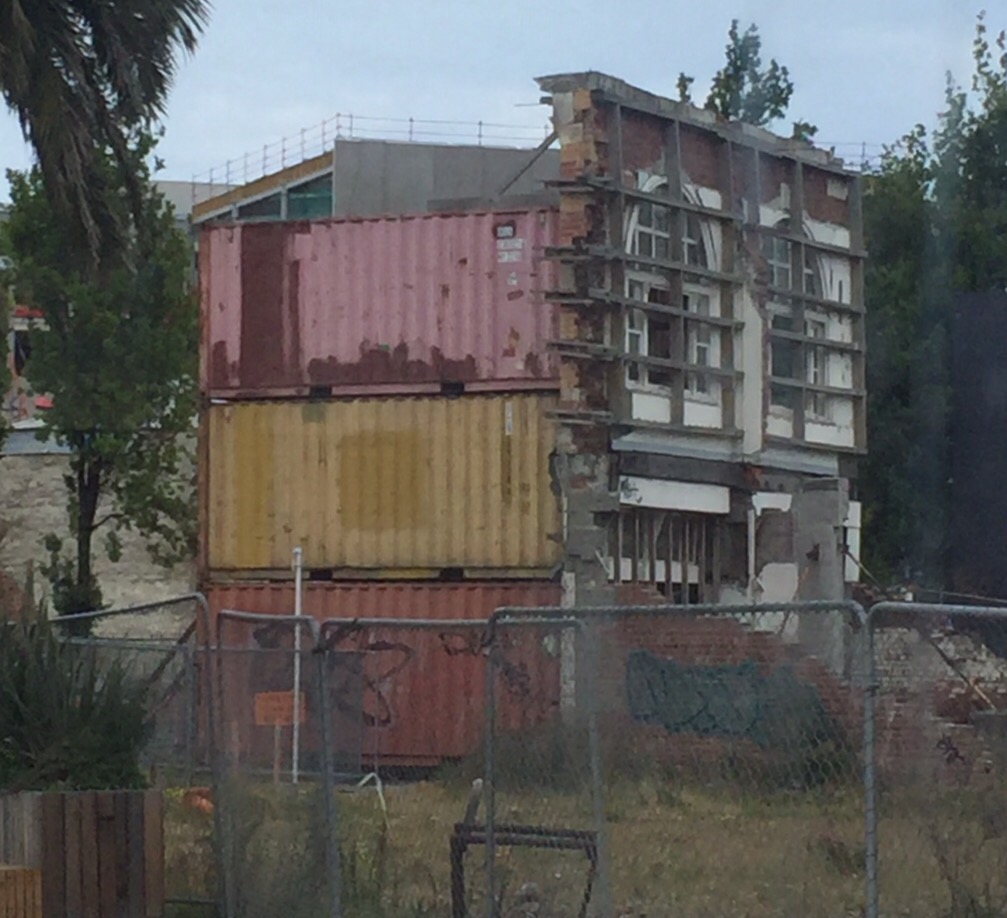 Now, I have to say one of the most noticeable things about talking to anyone about Christchurch is there is a very distinct notion of how things were before the earthquake, and how things are now. You notice the effects immediately. Shipping containers line roads next to cliff sides to keep rocks and rubble from falling onto the streets and houses. Remains of houses and foundations still sit on some cliffsides waiting to be demolished. Construction zones are everywhere and road closures change weekly to accommodate the work.