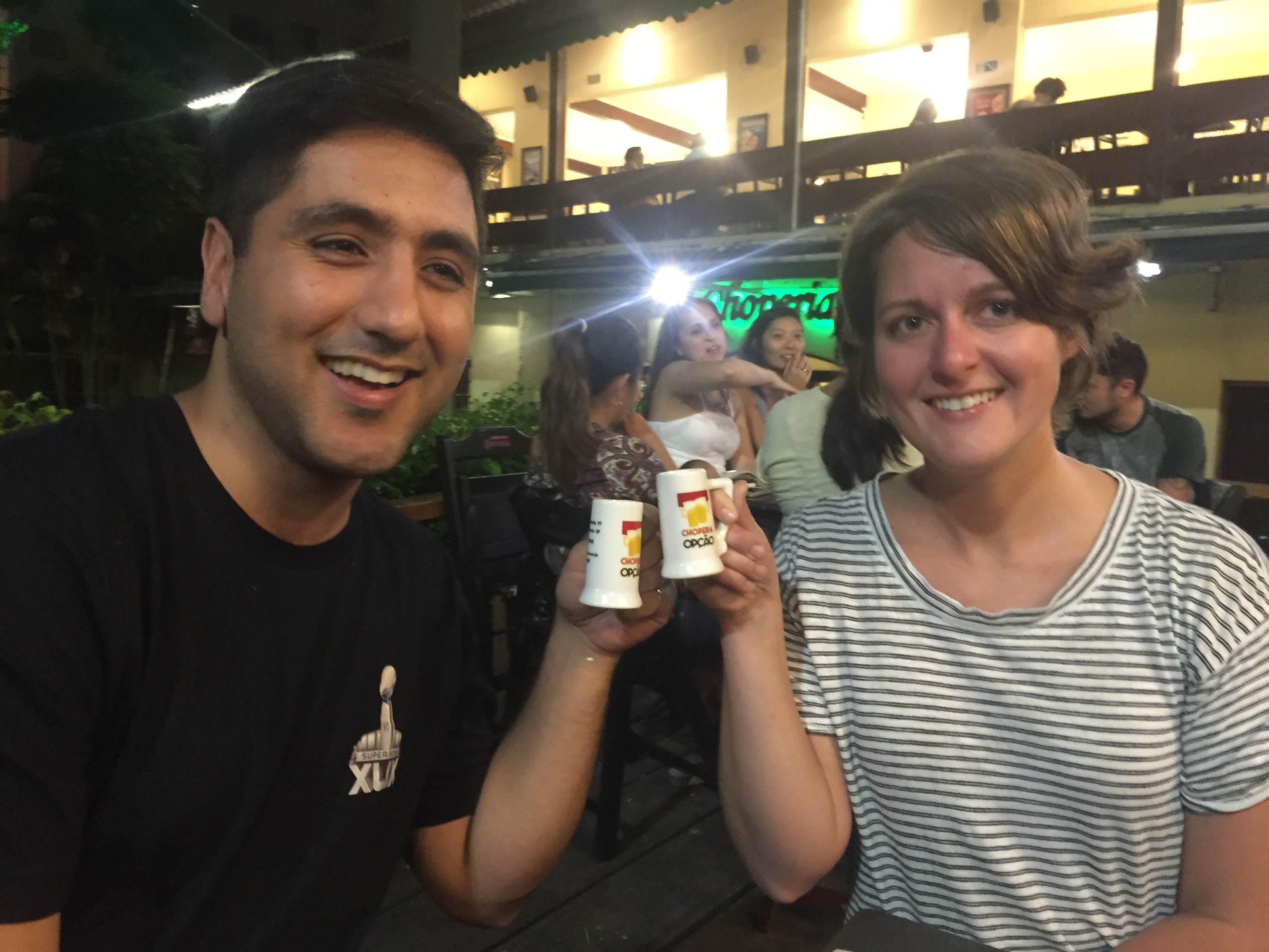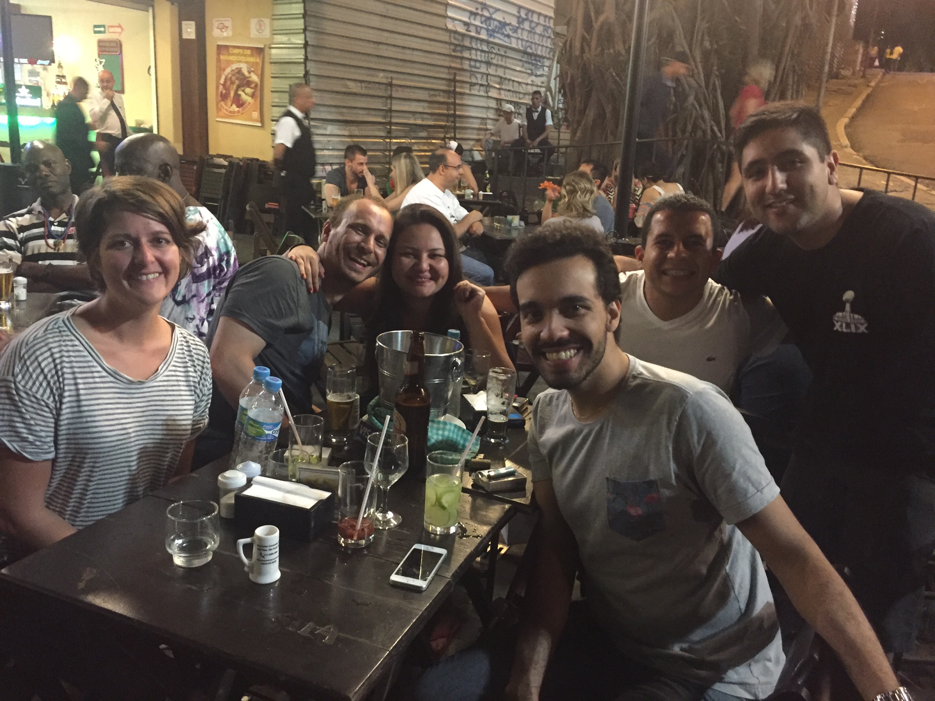 Our second drinks were the caipirinha- traditionally made with limes, honey, and some unknown type of alcohol. They gave us a bunch of tips- like don’t use your credit card at those mall kiosks (my credit card information did get stolen the next day 😕)- and phrases more useful than “I drink milk”. The Portuguese lessons transgressed into the cuss words and we relayed more of our challenges of the day. TJ told Artur that the only phrase we knew was “Bebo leite” and so we’d been using that kind of as a joke to random folks to say that we didn’t “falo Portuguese” (falo =I speak). That’s when we learned that in Portuguese “milk” can also be slang for….”sperm”. That’s correct. TJ had been telling random men and women all day that he drank sperm. I laughed so hard I cried.