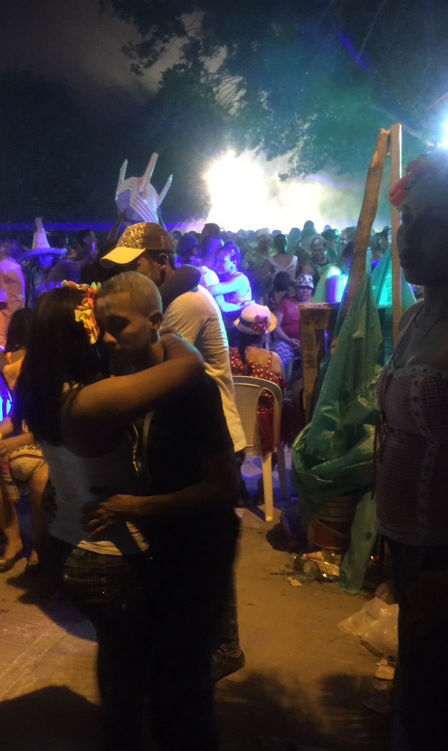 For the celebration, all of the bars set up their speaker systems outside and competed for the loudest music on the street. They also sold beer, but most groups of people had their own bottle of aguardiente to share. According to tradition, everyone sprayed each other with canned foam and covered each with flour. The streets were packed with people and obviously everyone was dancing their hearts out.